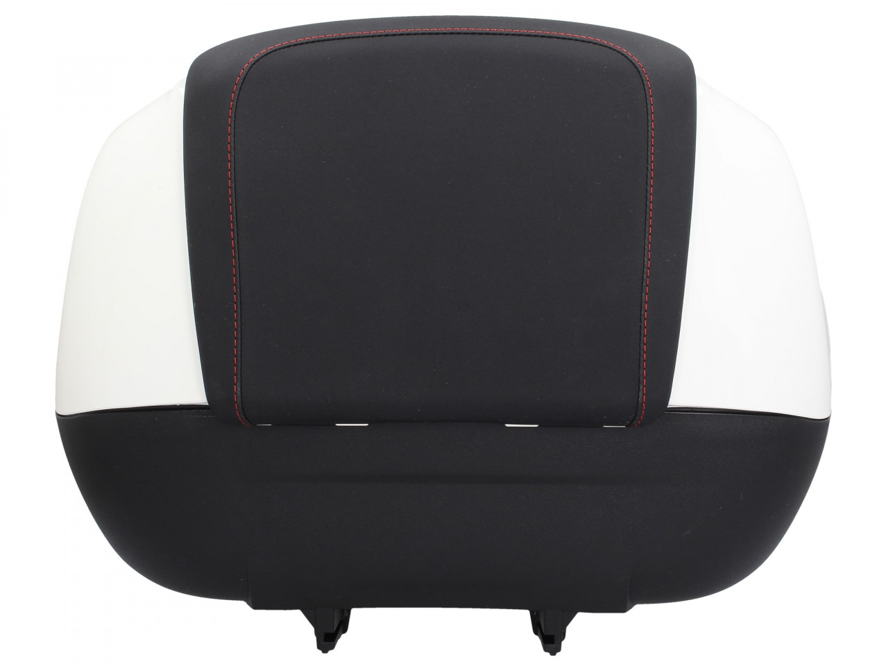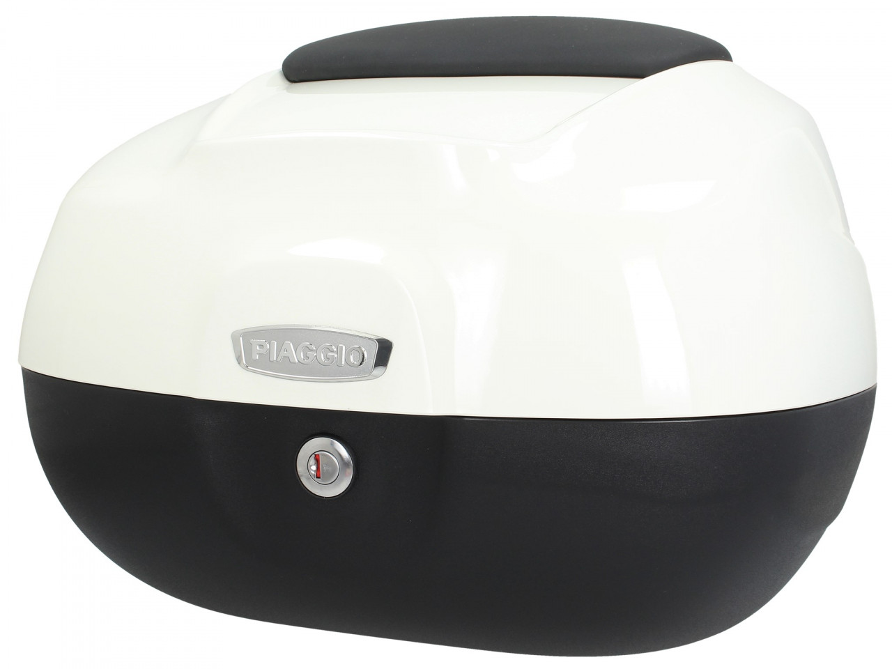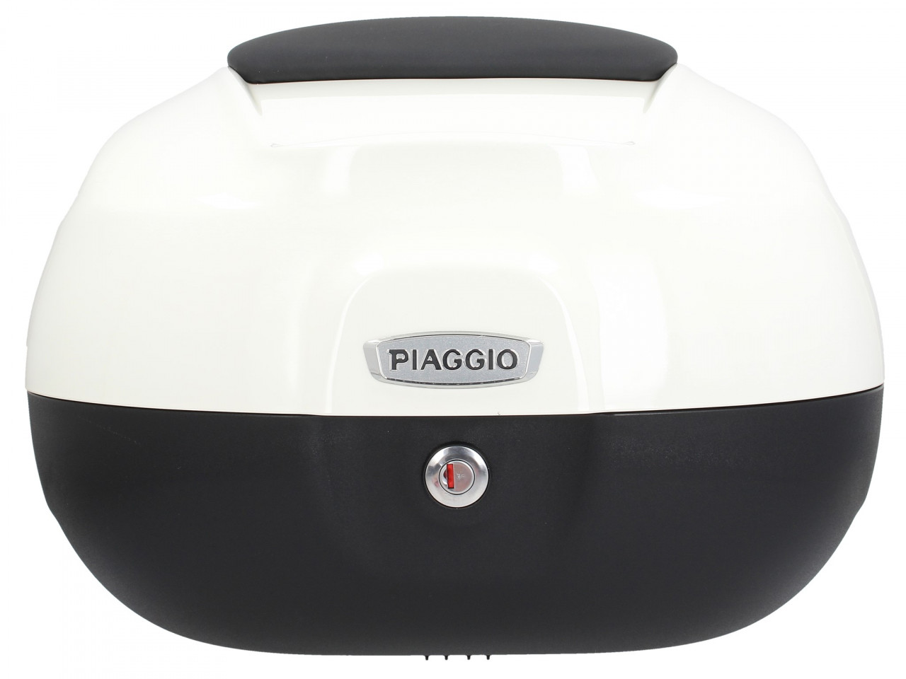 Top box de liberación rápida de 37 litros (para un casco modular o dos cascos demi-jet). La cubierta es del mismo color que el vehículo y el logo de Piaggio. Incluye un respaldo de confort para el pasajero en el mismo material y color que el sillín. Se requiere el kit de instalación 1B003247 para el montaje en un portaequipajes estándar.