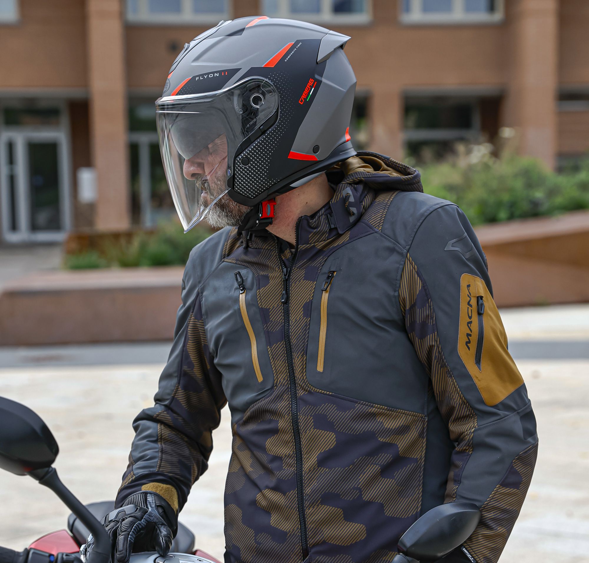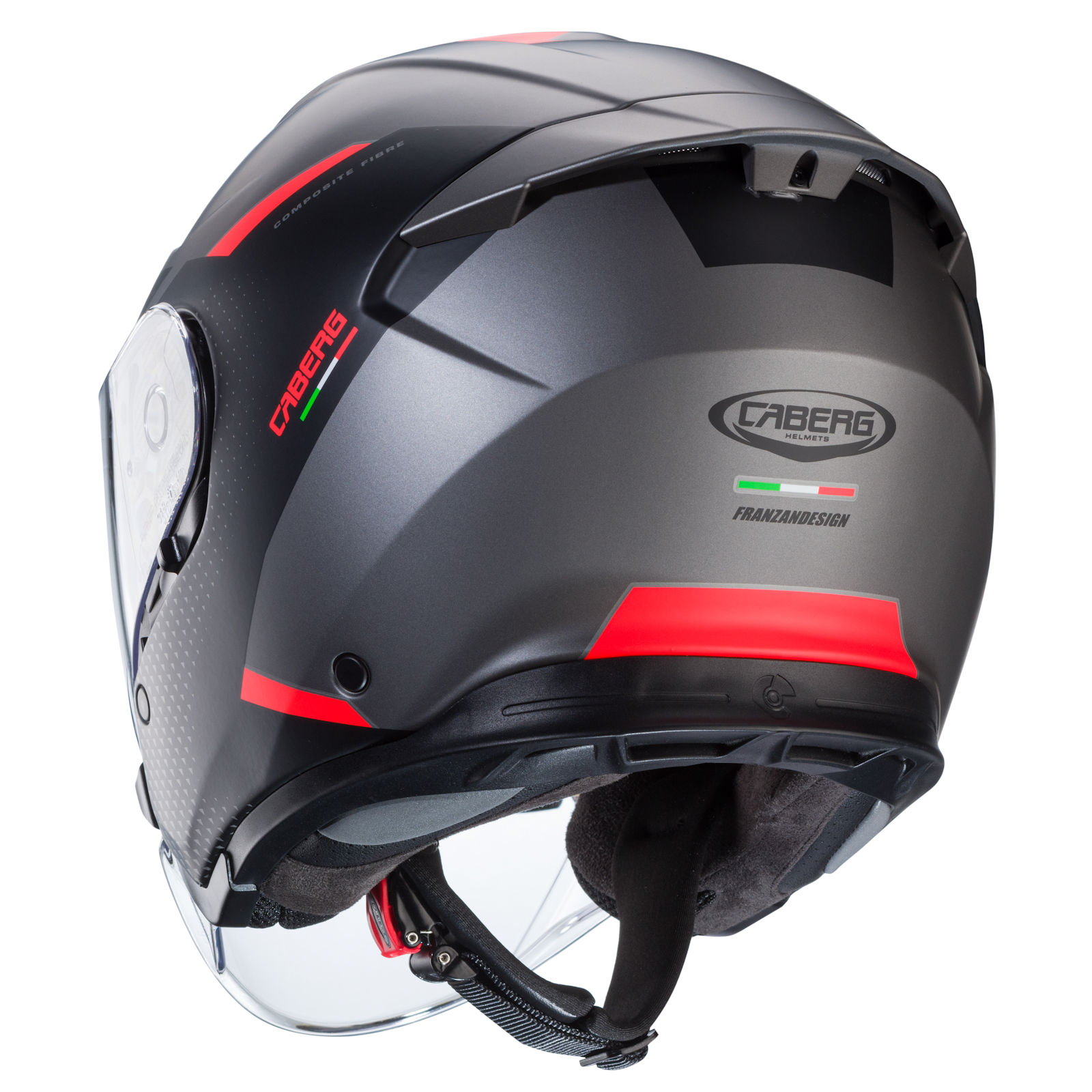 El casco jet Caberg Flyon II con la decoración Boss en gris mate/rojo/negro tiene las siguientes características: