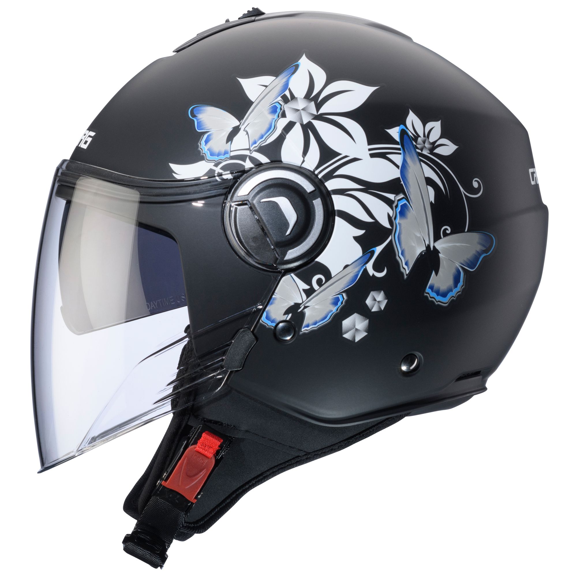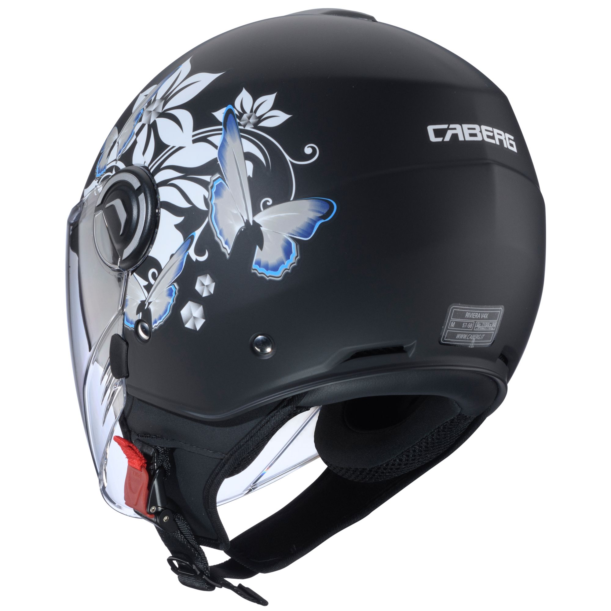 El casco jet Caberg Riviera V4 X con la decoración Mia en los colores negro mate/blanco/gris/azul claro tiene las siguientes características: