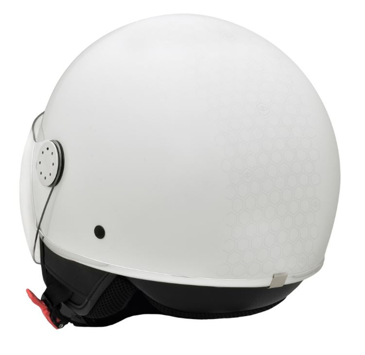 Casco demi-jet de material ABS con ecopiel cosida en la calota, visera transparente de 2 mm con cubiertas de aluminio y visor solar retráctil. Mentonera con cierre micrométrico y anilla antirrobo. Material interior innovador y transpirable, el forro interior es extraíble y lavable. Homologación ECE 22.06. Código de color: BR_white montebianco / innocenza / 544