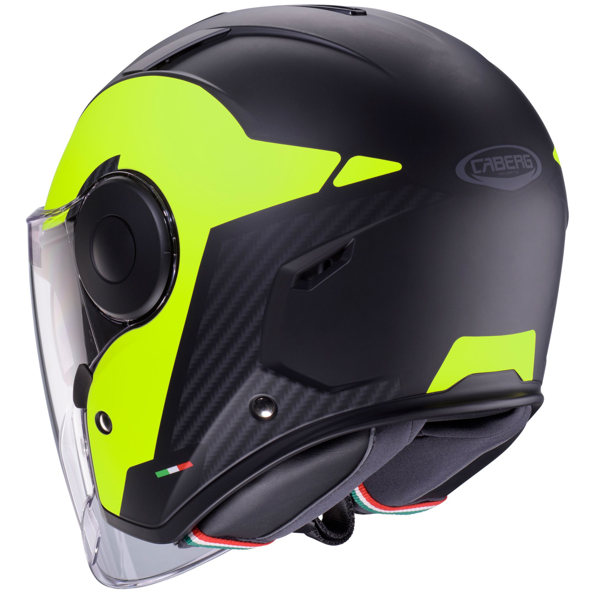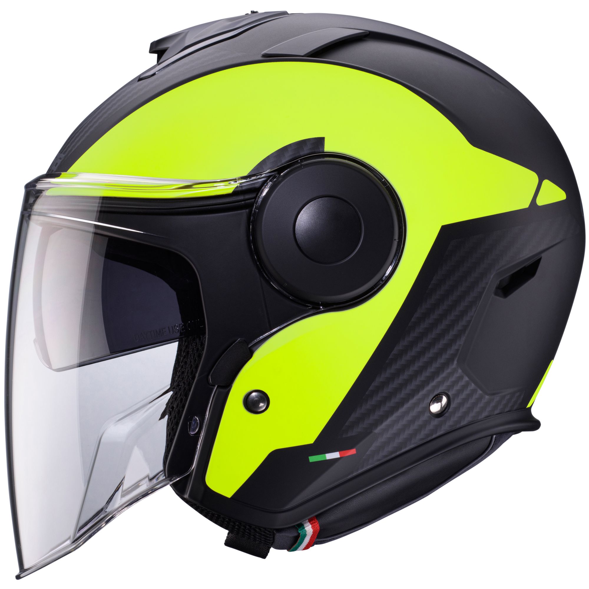 El casco jet Caberg Soho con la decoración Milano en los colores negro mate/amarillo fluo tiene las siguientes características: