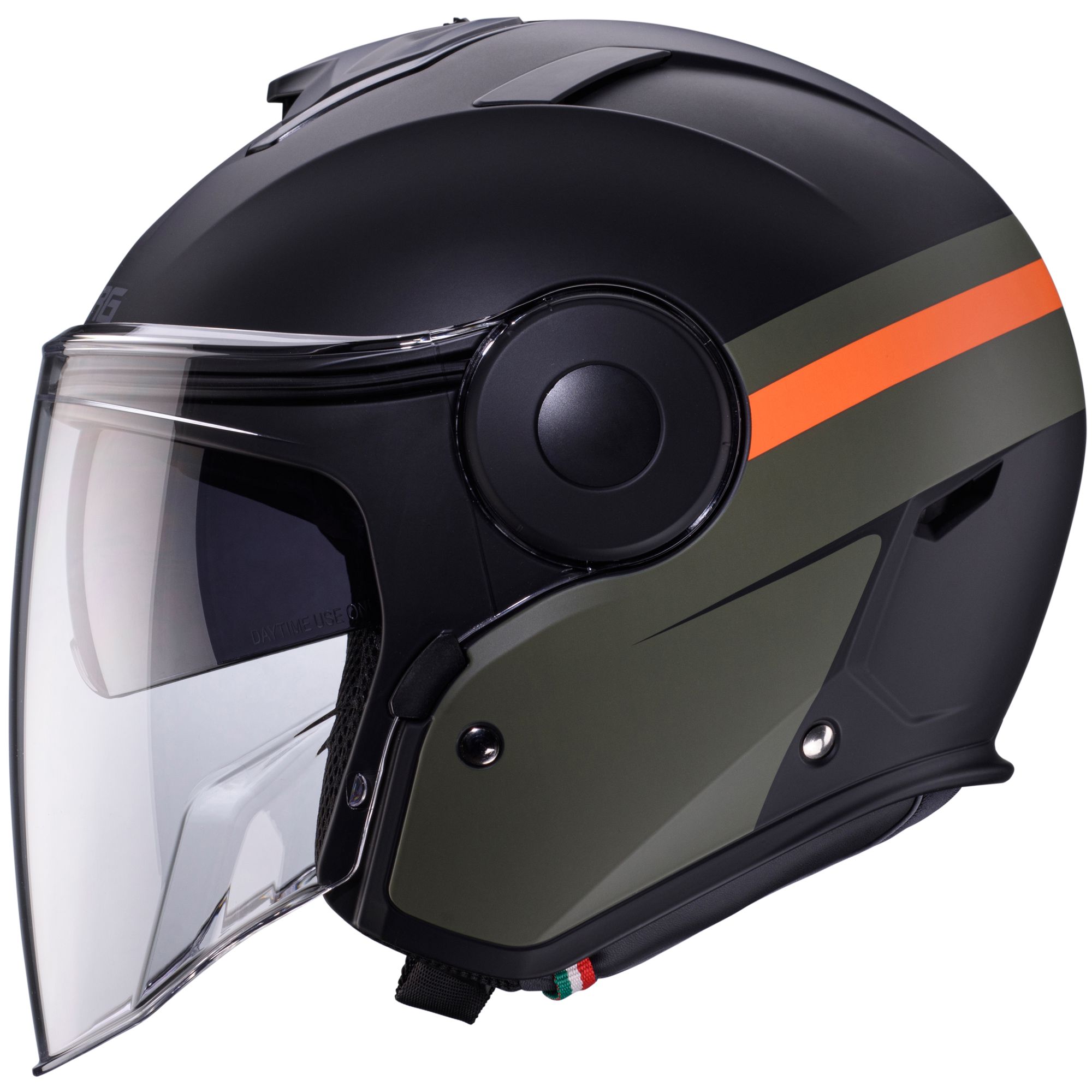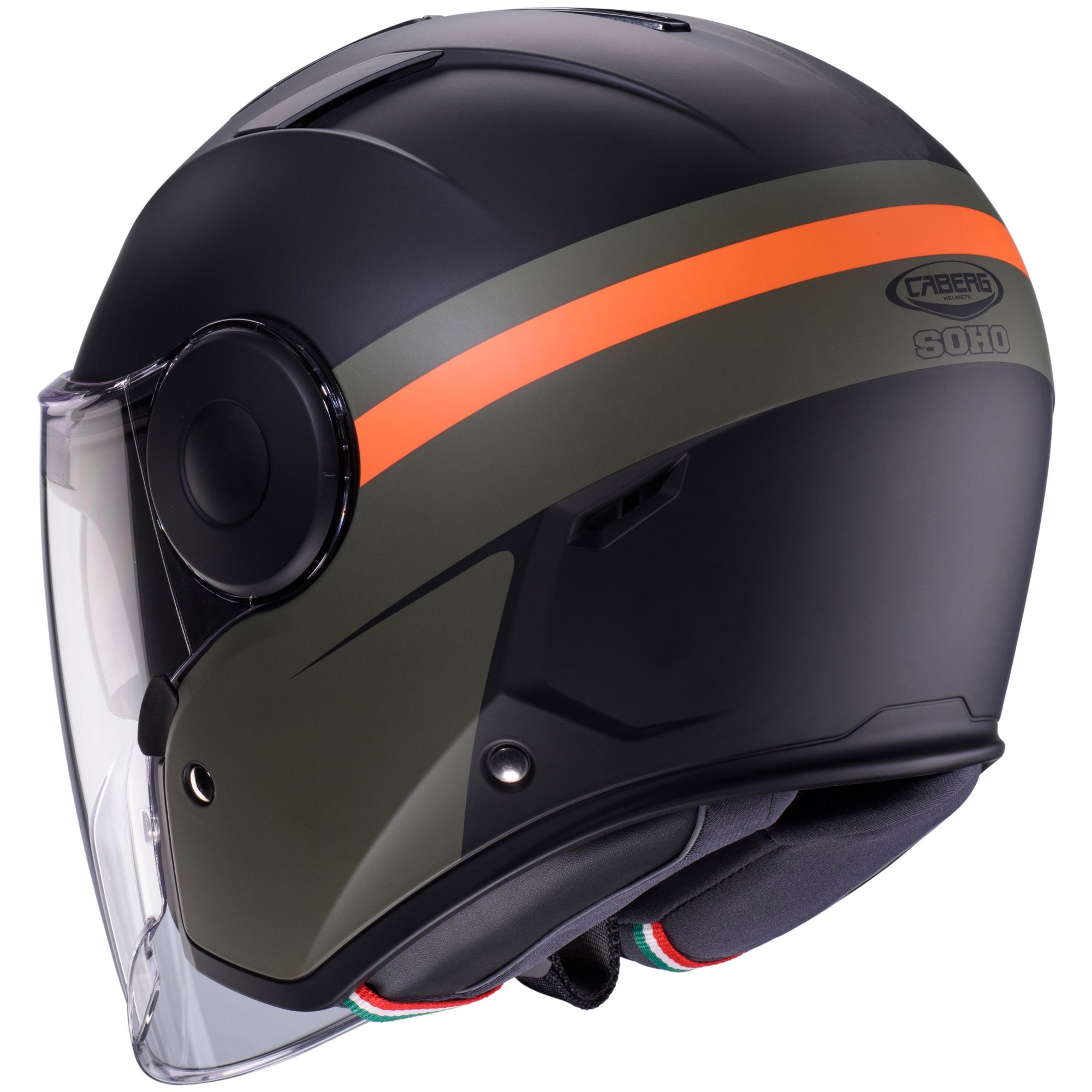 El casco jet Caberg Soho con la decoración Zephyr en los colores negro mate/verde-naranja tiene las siguientes características: