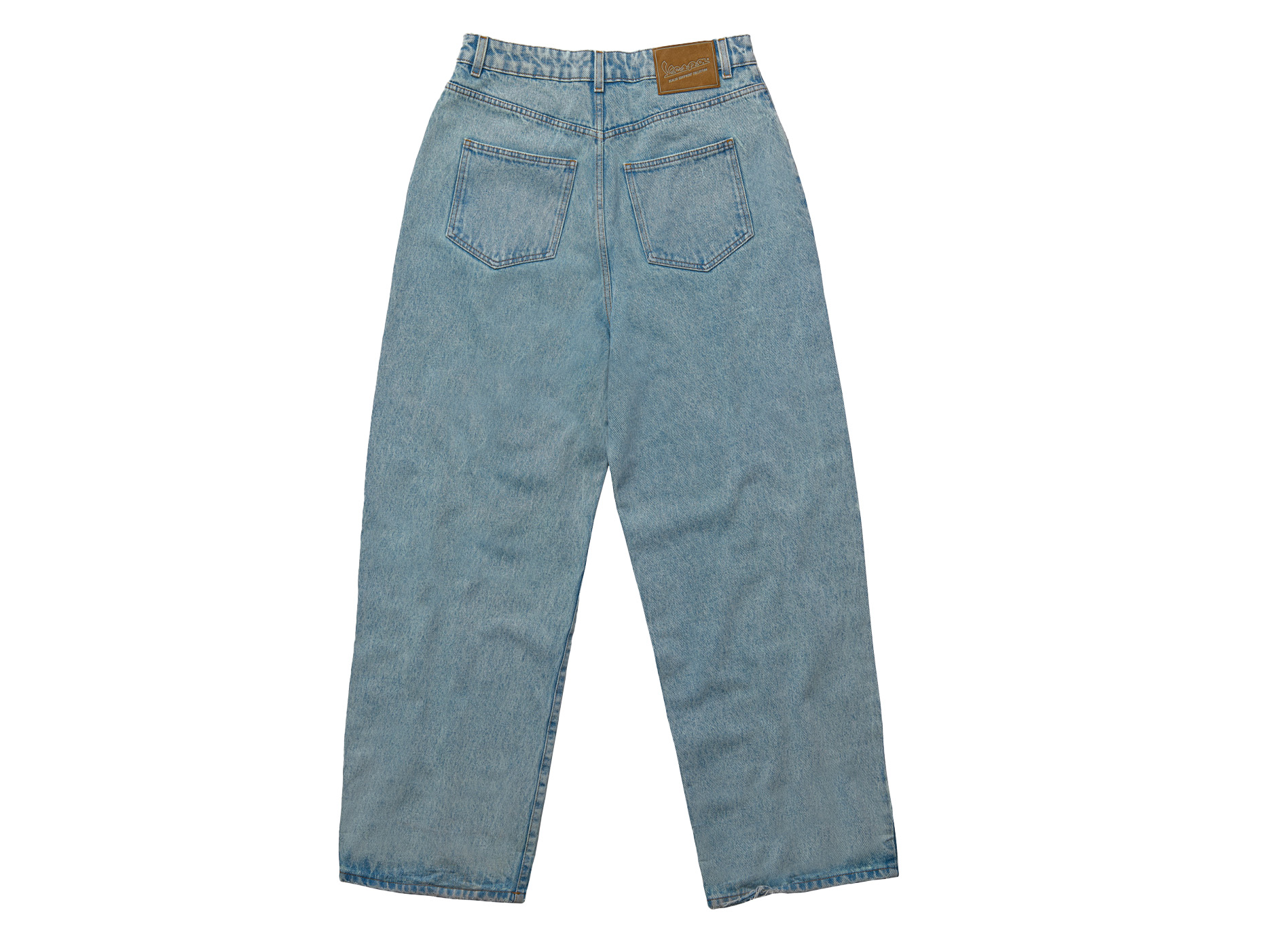 Tejido vaquero oversize y unisex, de cintura baja y pernera ancha. Origen y Nómada son sobreteñidos que dan a la prenda una transición de color gradual. Negro es un lavado vintage que crea tonos claros en la prenda. La etiqueta de cuero repujado con el logotipo en color de contraste en la parte trasera es especialmente llamativa.