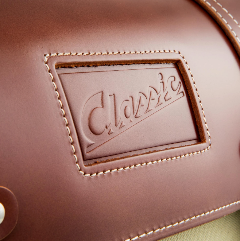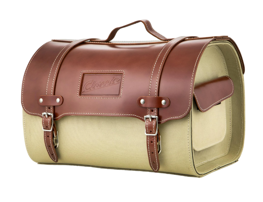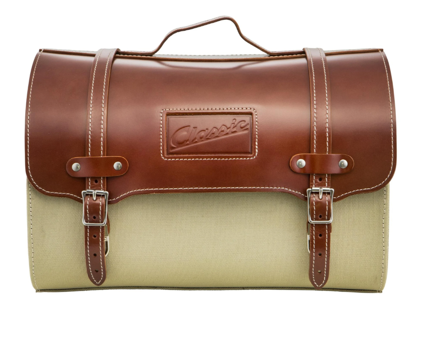 Fabricado en cuero y lona, el maletín confiere a todas las Vespas un aspecto vintage y llama especialmente la atención en cada scooter con su inscripción "Classic". El gran compartimento principal ofrece espacio suficiente para guardar con seguridad la compra del supermercado, las compras del mercado semanal o el casco.