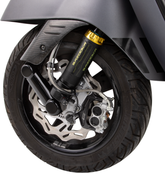 El kit de frenos SIP PERFORMANCE está completamente listo para instalar y se adapta perfectamente a las condiciones de la Vespa moderna. La pinza de freno de 4 pistones "NEW ERA" fresada con CNC de Ottopuntouno con una superficie ampliada de pistón y pastilla es resistente a la torsión y significativamente más ligera que la original. Suministramos el adaptador fresado CNC de aluminio a juego. Este está fabricado con precisión y permite el montaje de la pinza de freno radial, lo que significa que se pueden alcanzar los valores de frenado de una motocicleta deportiva moderna. Con la grabación, es posible el uso de un disco de freno de gran tamaño, se pueden conducir diámetros de hasta 260 mm con la ayuda de espaciadores adecuados. Se requiere un tornillo de purga más profundo para discos de freno de 250 mm para que la llanta no toque la pinza de freno. Dado que la pinza de freno tiene un soporte M8 para la línea de freno, incluimos un tornillo hueco adaptador de línea de freno de Ø10 mm adecuado para la pinza de freno radial que incluye anillos de sellado.