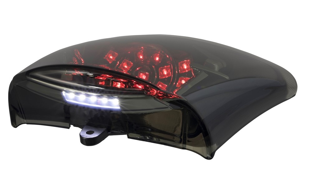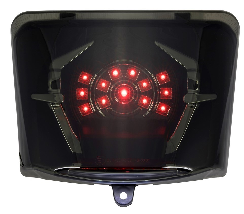 La luz trasera LED SIP MK II para los modelos Vespa GTS/GTV se adapta bien a la forma de la parte trasera e impresiona con sus luces LED muy brillantes y potentes . La disposición única de los LED y el reflector modificado diferencian claramente la luz trasera del original. Disponible en variantes con cristal transparente o tintado, con número E, incluida luz de matrícula LED. Las luces traseras son adecuadas para los modelos GTS más antiguos (antes del `14). Con el marco de conversión (artículo n.º MV01959), los modelos renovados de 2014 también se pueden convertir a la luz trasera LED.