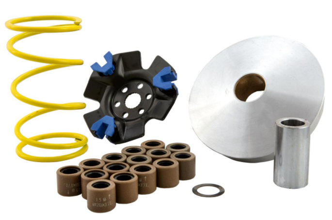 Una pequeña pero extremadamente fina pieza de ajuste en el área de scooter es el variador, ya que es el corazón de la conducción de cada scooter automático. Por lo tanto, la instalación de un variador optimizado no solo determina la aceleración y el par, sino también el buen funcionamiento de un vehículo. ¡El imprescindible para todos los pilotos de 2/4 tiempos! El ZELIONI Variomatik fue desarrollado especialmente para el peso y el tamaño de rueda de los modelos Vespa GTS/GT. Producción CNC de alta precisión de las pistas de rodadura con un ángulo de paso calculado exactamente para una aceleración óptima y una velocidad máxima máxima. Se incluyen resortes de contrapresión Vario, diferentes pesos Vario y espaciadores.