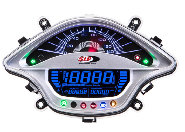 El velocímetro/tacómetro SIP reemplaza el velocímetro estándar muy escasamente equipado con un dispositivo multifuncional real. El velocímetro impresiona con su gran pantalla analógica para la velocidad (hasta 140 km/h) y la velocidad del motor (hasta 14.000 rpm). Por lo tanto, la aguja del velocímetro muestra las rpm o la velocidad. En la pantalla digital inferior se puede mostrar una selección de 18 funciones. Estos se pueden cambiar con solo presionar un botón. Además de las funciones estándar como visualización de velocidad analógica/digital, día y amp; Kilómetros totales, temperatura, el velocímetro tiene un analógico & cuentarrevoluciones digital, indicador digital de combustible y temperatura, acelerómetro para medir la distancia y la velocidad, velocidad media y muchas otras características (consulte la lista de funciones). La retroiluminación se puede seleccionar entre ocho colores diferentes. El brillo también se puede regular por separado. Antes de cada reinicio, el instrumento realiza una autocomprobación completa. La disminución de la velocidad se produce originalmente a través de la disminución de la velocidad integrada en el mazo de cables o puede transmitirse a través de un sensor de velocidad digital. Los sensores apropiados están disponibles como accesorios. En el volumen de suministro se incluye un juego de cables para la conexión al vehículo. Está conectado entre el velocímetro y el mazo de cables. Todo sin soldadura, simple y sin complicaciones. La configuración y el cambio entre las funciones se realizan mediante el botón "Modo" original del vehículo.