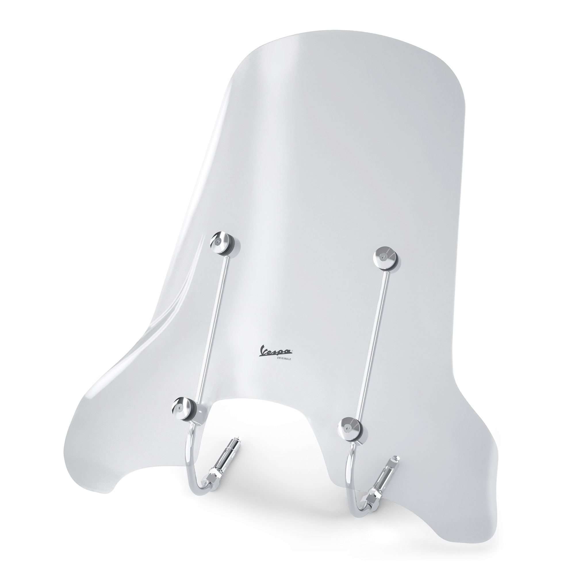 Parabrisas alto (con soporte) de metacrilato de 4 mm de grosor. Con logotipo Vespa y soportes cromados. Proporciona una protección óptima contra el viento y la intemperie.